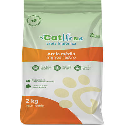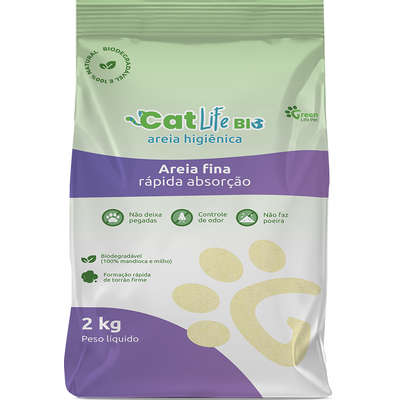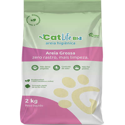 A areia Green Life é biodegradável, feita de mandioca e milho. Além disso, ela é 100% natural e não agride o meio ambiente.